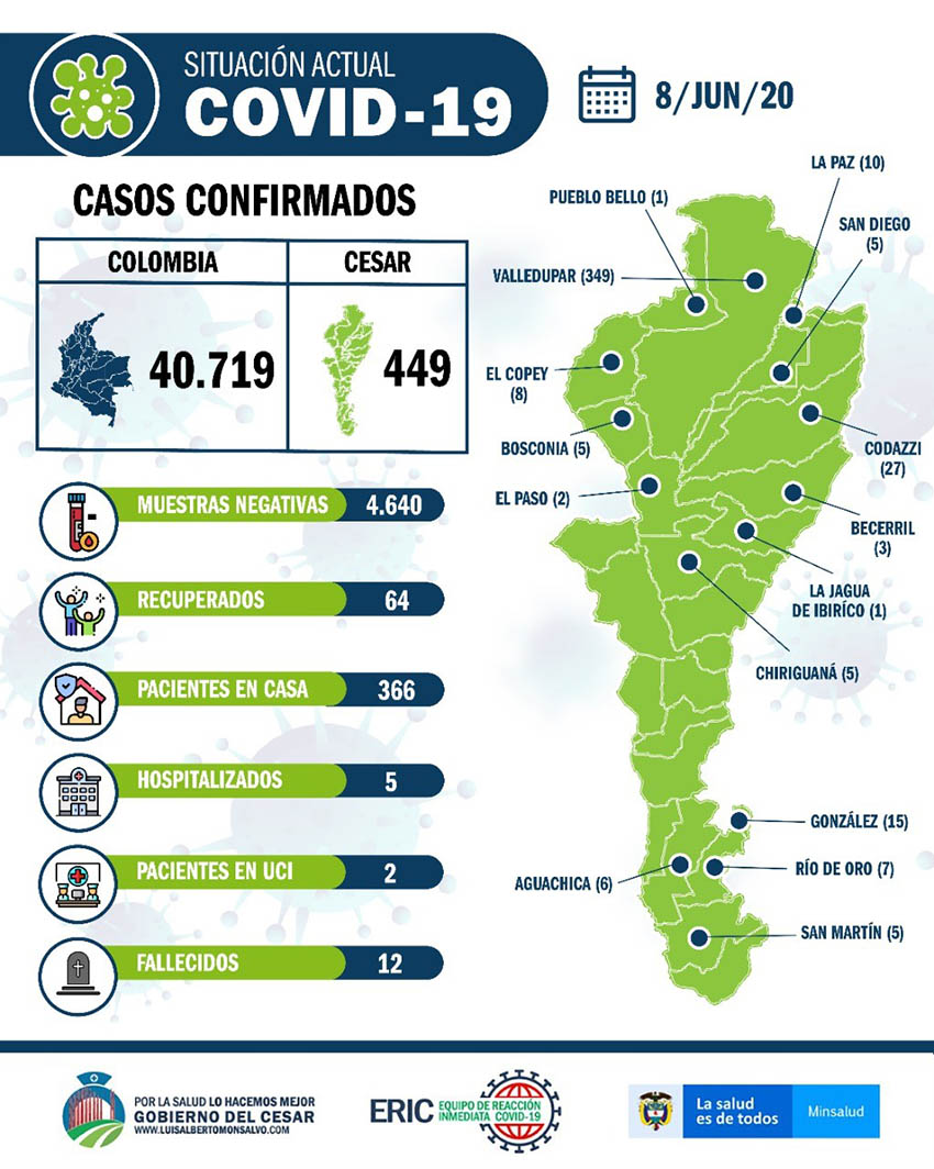 Con el nuevo reporte, los casos positivos de COVID-19 por municipio se distribuyen así: Valledupar (349); Codazzi (27); González (15); La Paz: (10); El Copey (8); Río de Oro: (7); Aguachica (6); Chiriguaná (5); San Diego (5); San Martín (5); Bosconia (5); Becerril (3); El Paso (2); Pueblo Bello (1); La Jagua de Ibirico (1).