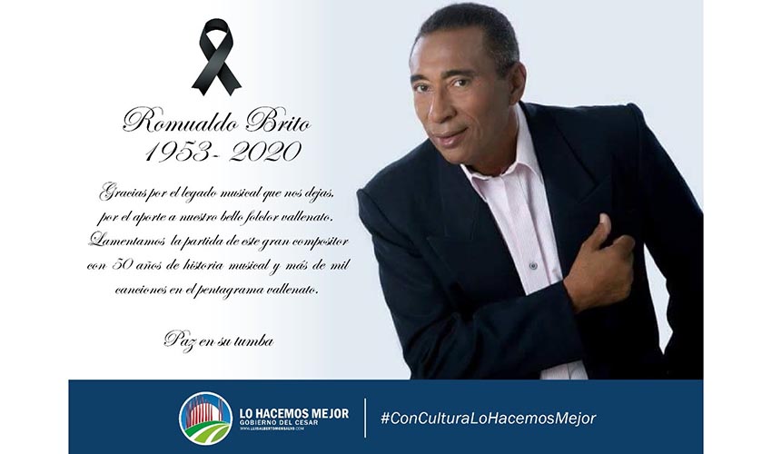 El gobernador Luis Alberto Monsalvo, en nombre de la administración departamental, lamentó la muerte del autor de más de 1.400 canciones que enriquecen el folclor vallenato. “Nos unimos a ese sentimiento del Cesar y La Guajira que son una sola tierra hermanada por nuestra música, Romualdo Brito con su gran talento, nos hizo disfrutar de hermosos momentos y puso a vibrar nuestras emociones a través de sus composiciones”, expresó el mandatario.