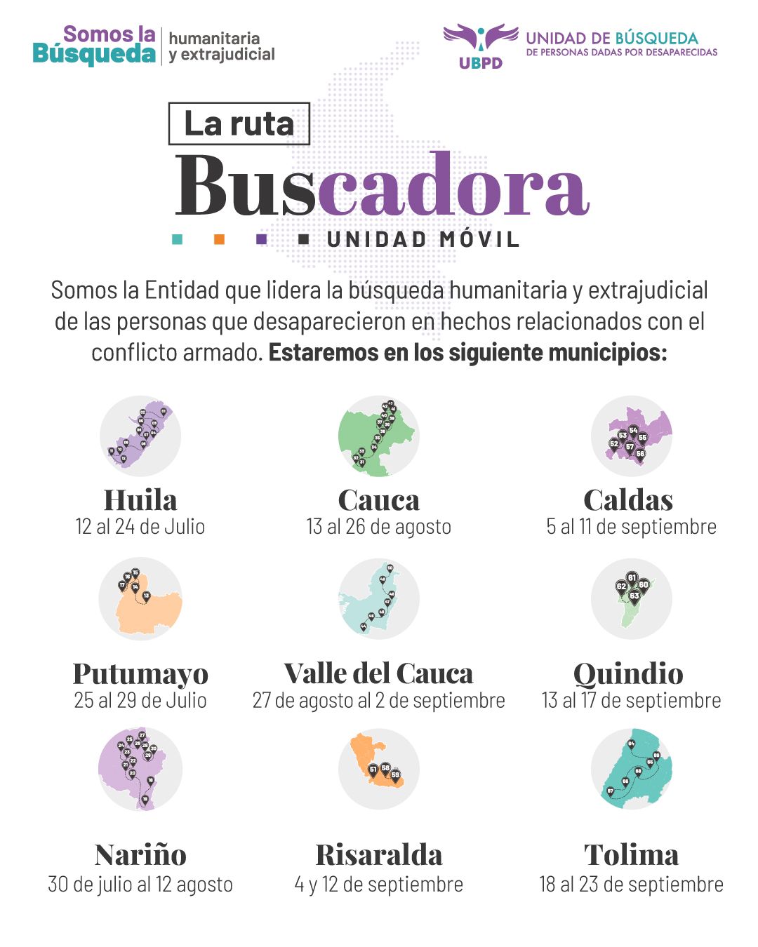 A partir del próximo sábado 12 de julio, en el municipio de Tello, Huila, la Unidad de Búsqueda de Personas dadas por Desaparecidas pondrá en marcha La Ruta Buscadora, una unidad móvil que durante el segundo semestre del 2025 recorrerá, en dos fases, 14 departamentos y 119 municipios del suroccidente y norte del país, con el fin de llegar a territorios donde la entidad no tiene presencia permanente, para contribuir a la búsqueda de las más de 126.000 personas desaparecidas que ha dejado el conflicto armado en Colombia y aliviar el dolor de sus familias, que durante años han esperado respuestas.
