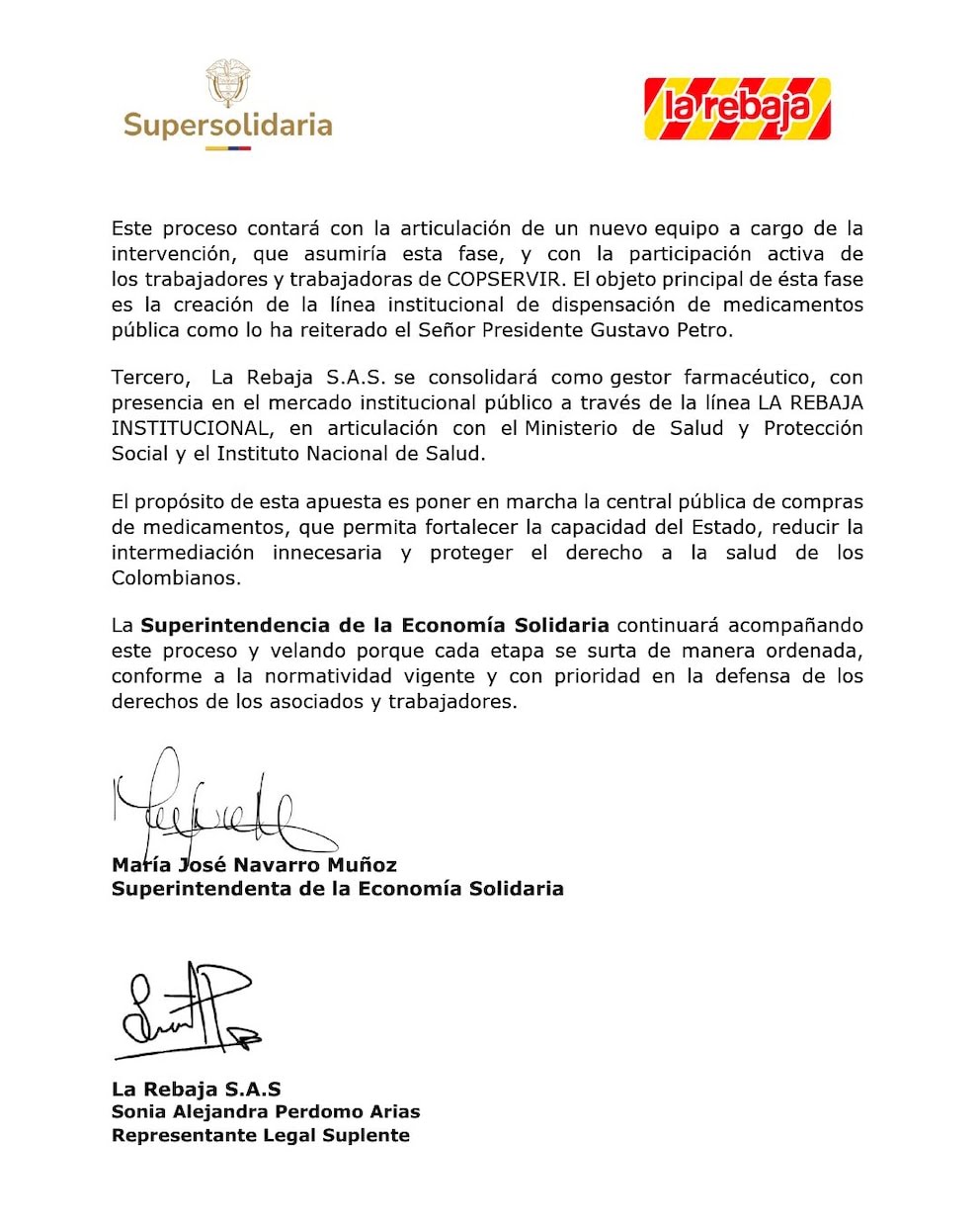 A través de la Superintendencia de la Economía Solidaria, se anunció que La Rebaja S.A.S. se consolidará como gestor y administrador farmacéutico del Estado, en el marco de una nueva fase de la intervención a la cooperativa Copservir, antigua propietaria de la cadena de droguerías.