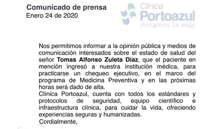El “Pulmón de Oro” había ingresado el jueves de la semana pasada a revisión a la Clínica Porto Azul, para realizarse un “chequeo ejecutivo, en el marco del programa de Medicina Preventiva”, según informó un comunicado del centro médico.