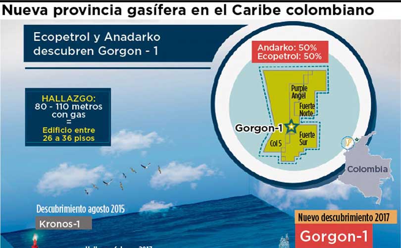 Ecopetrol encontró presencia de gas en dos lugares del pozo exploratorio Gorgon-1, que sumados a los hallazgos de Kronos-1 y Purple Angel-1, confirmarían una provincia gasífera en aguas profundas (entre 3.675 y 4.415 metros de profundidad) del Caribe colombiano.