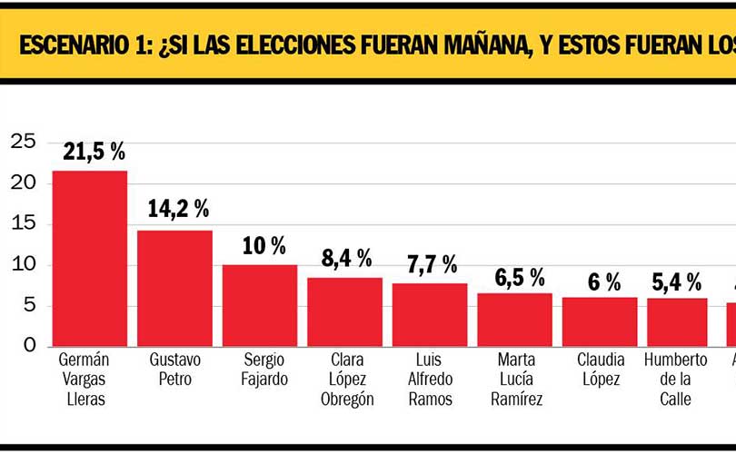 En el panorama nacional la encuesta incluyó a las figuras más representativas de cada fuerza, para indagar sobre la intención de voto de los colombianos. En el primer lugar del cuadro general aparece el exvicepresidente Germán Vargas Lleras con 21,5 por ciento de intención de voto. Su posición es sólida. Es el líder de la carrera por razones más que explicables: ha estado en el escenario público en los últimos años, como ministro y vicepresidente, asociado con programas que los colombianos comunes y corrientes valoran: la construcción de vivienda y de obras de infraestructura. En esas tareas el exvice recorrió el país de arriba abajo y les tomó ventaja a sus competidores. Es el más conocido de todos los candidatos, y goza de una imagen positiva de 50,6 por ciento, que también es la más alta.